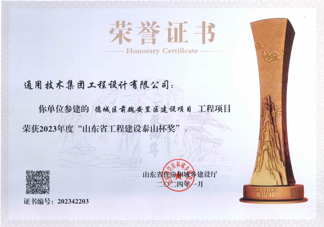 近日,公司收到山东省住房和城乡建设厅颁发的荣誉证书,公司参建的德城区前魏安置区建设项目荣获2023年度“山东省工程建设泰山杯奖”。